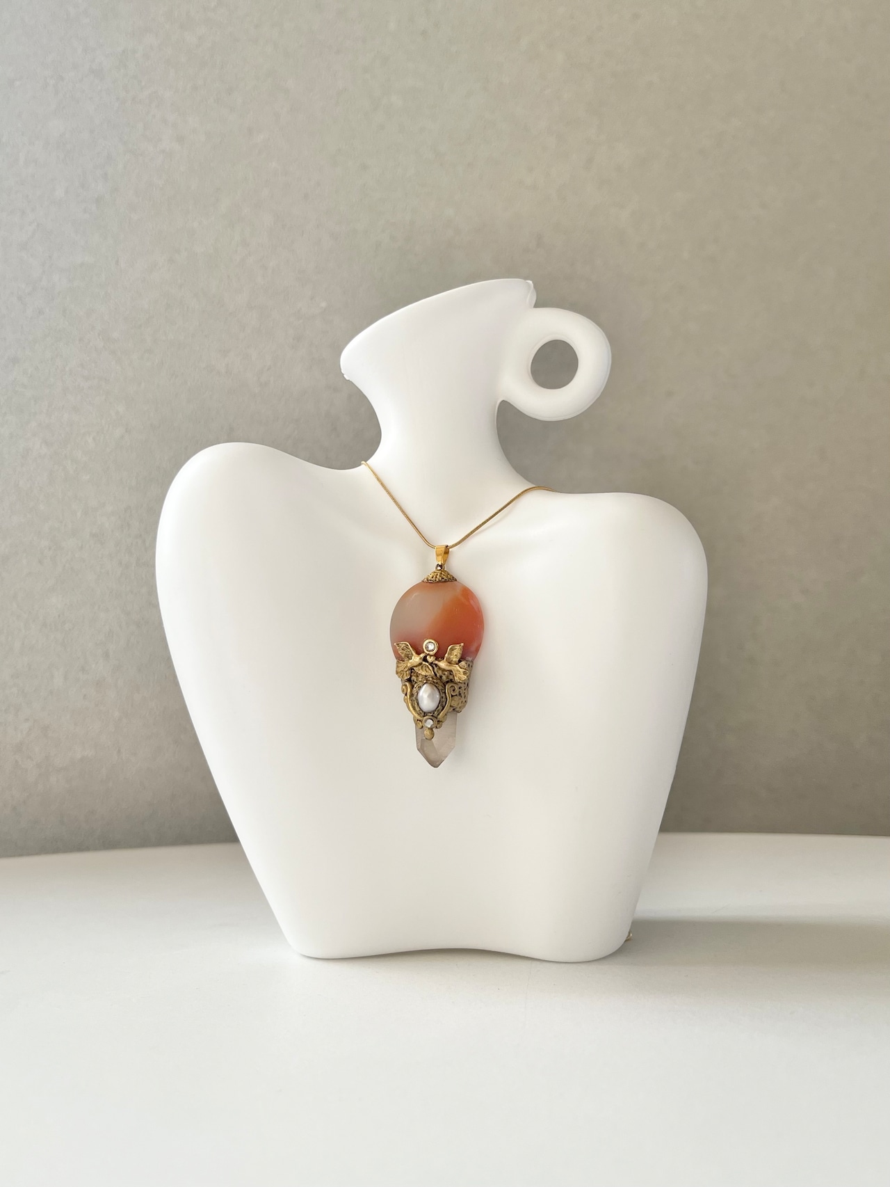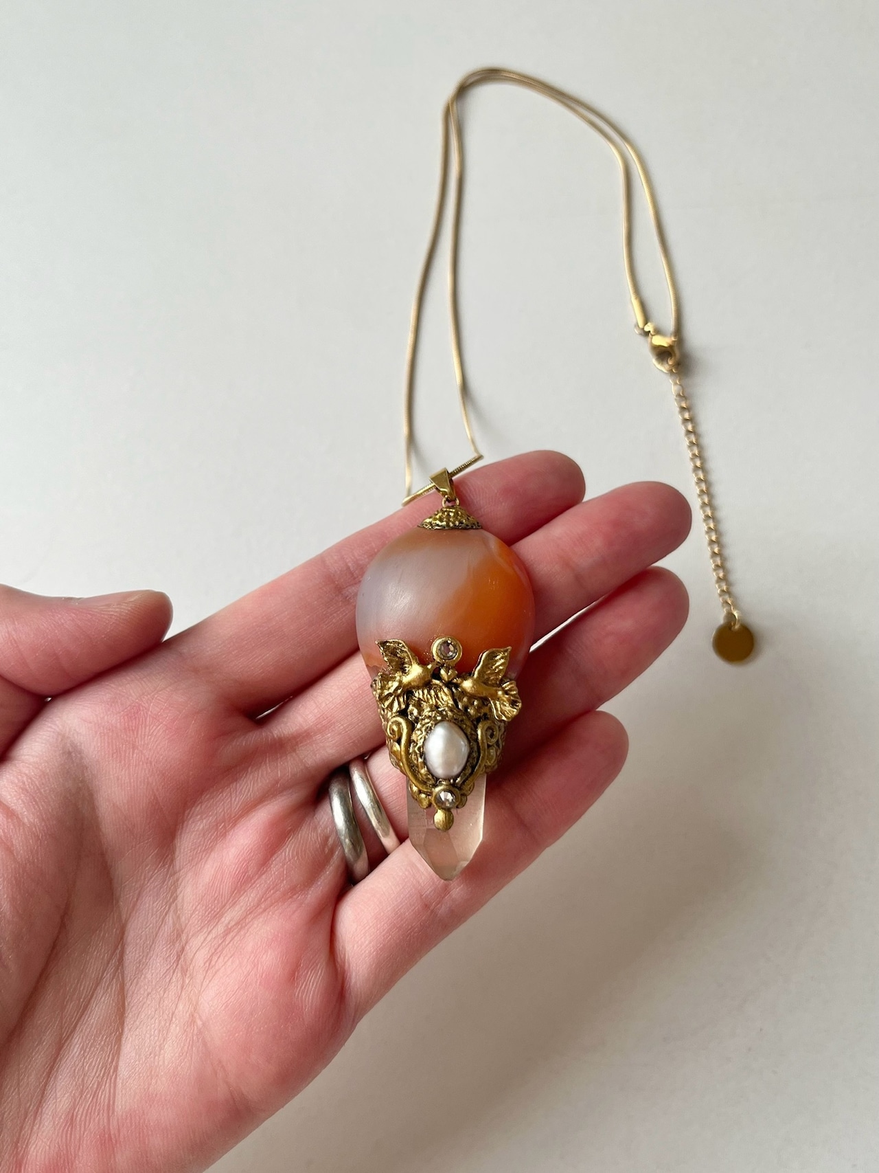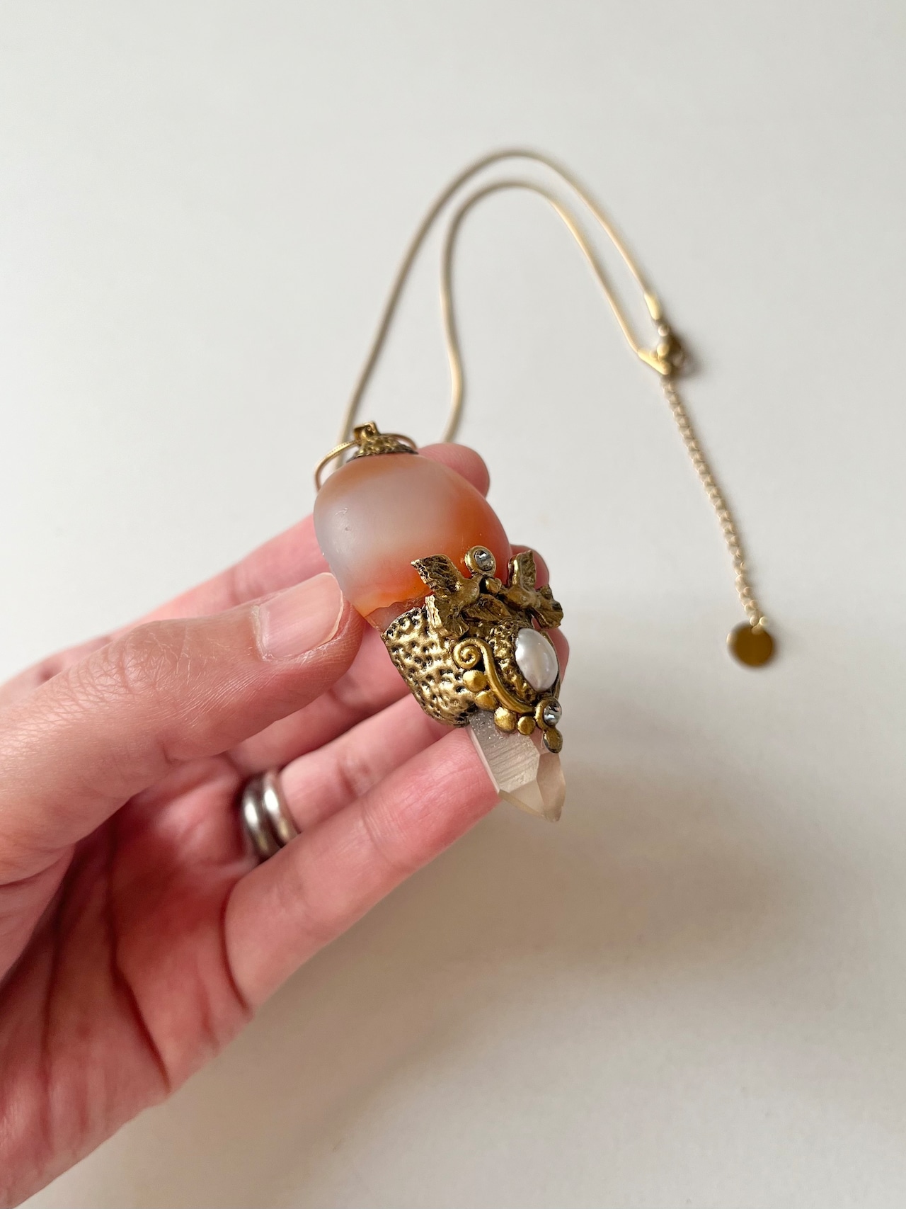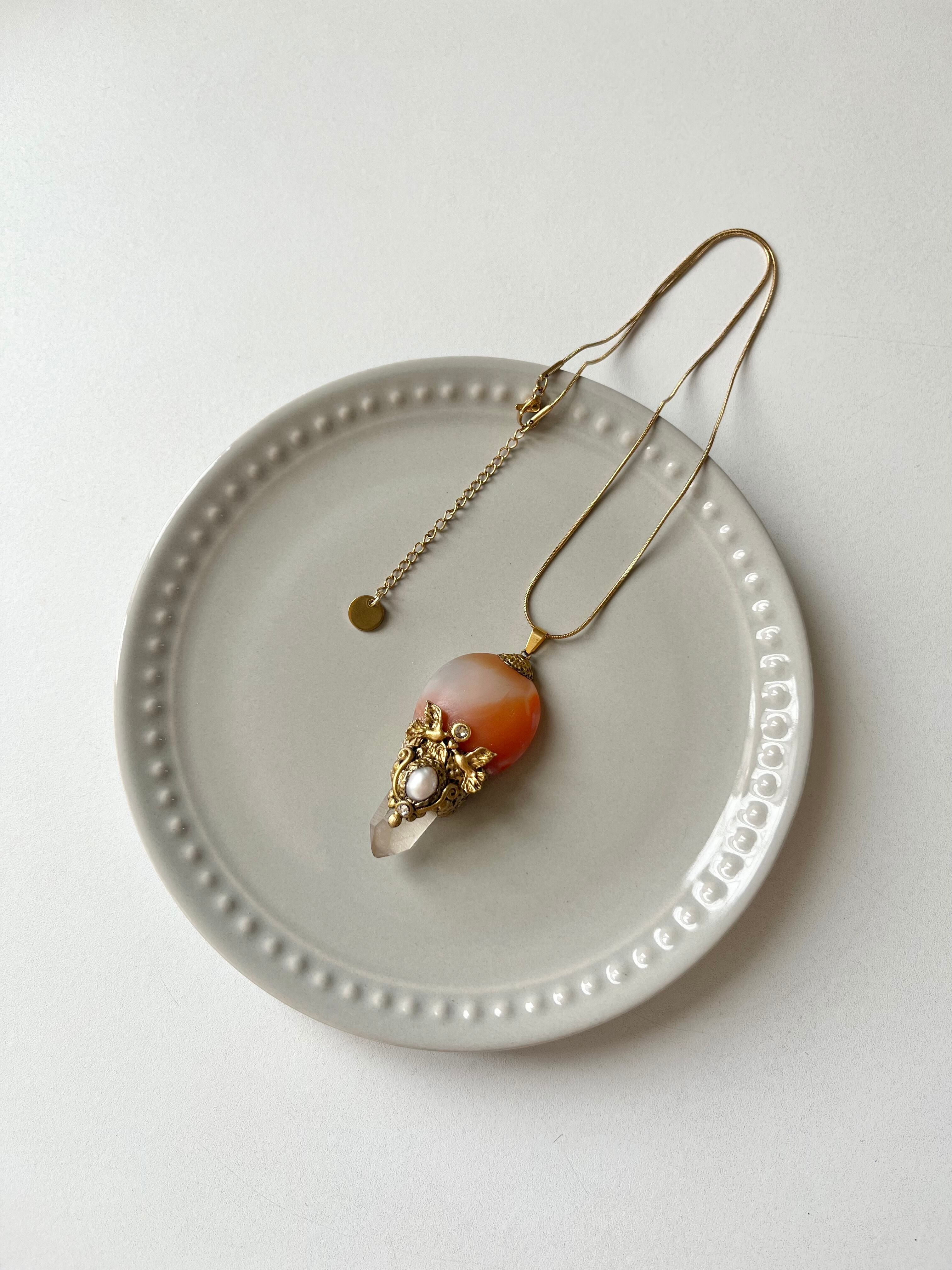 北海道産瑪瑙をメインに、平和の象徴とされる鳩のモチーフを組み合わせたワンドネックレスです。
