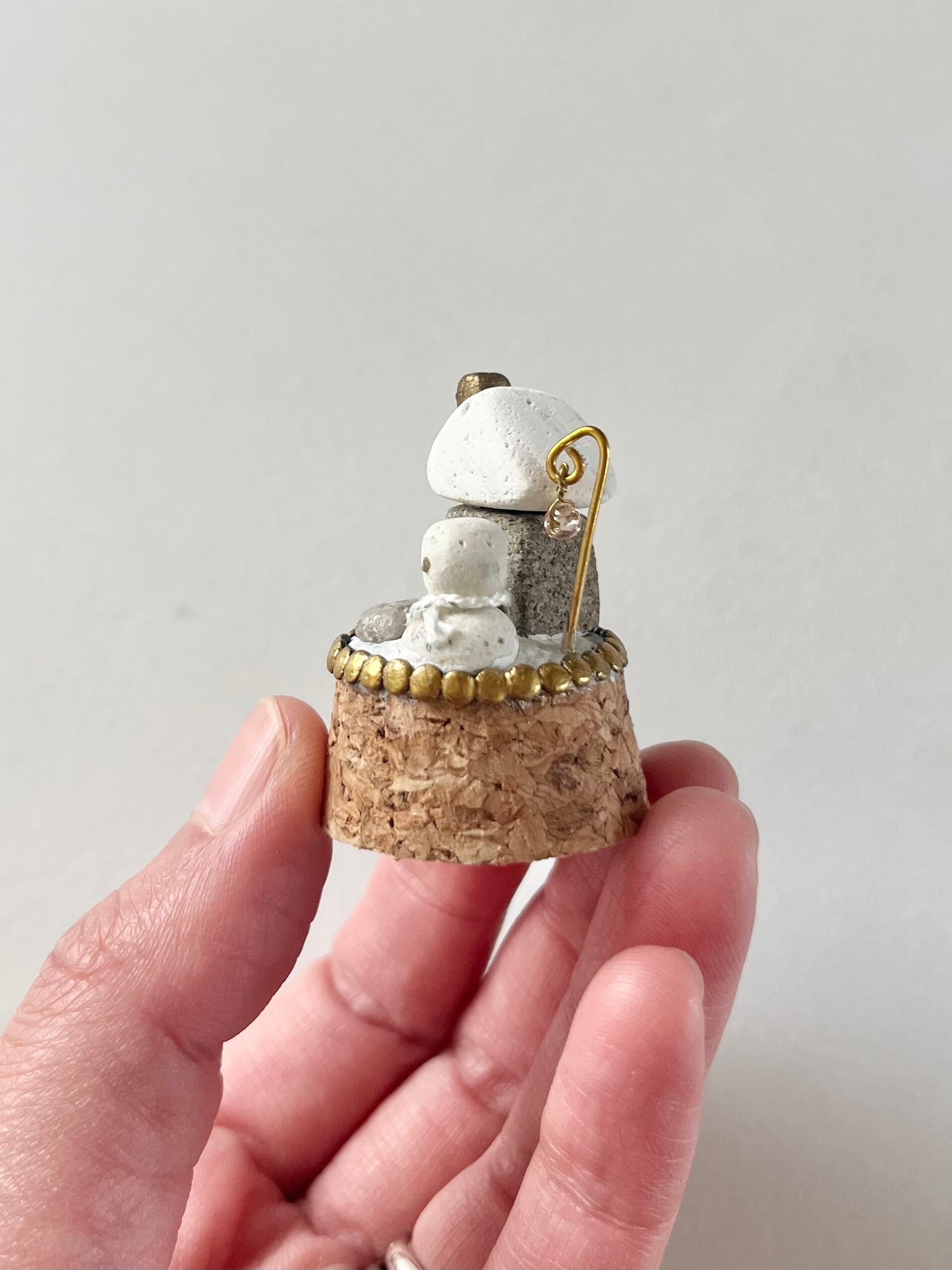 雪だるまの左横にちょこんと置いた小さなニニギ水晶は、キラキラと雪の光り輝く姿を演出。