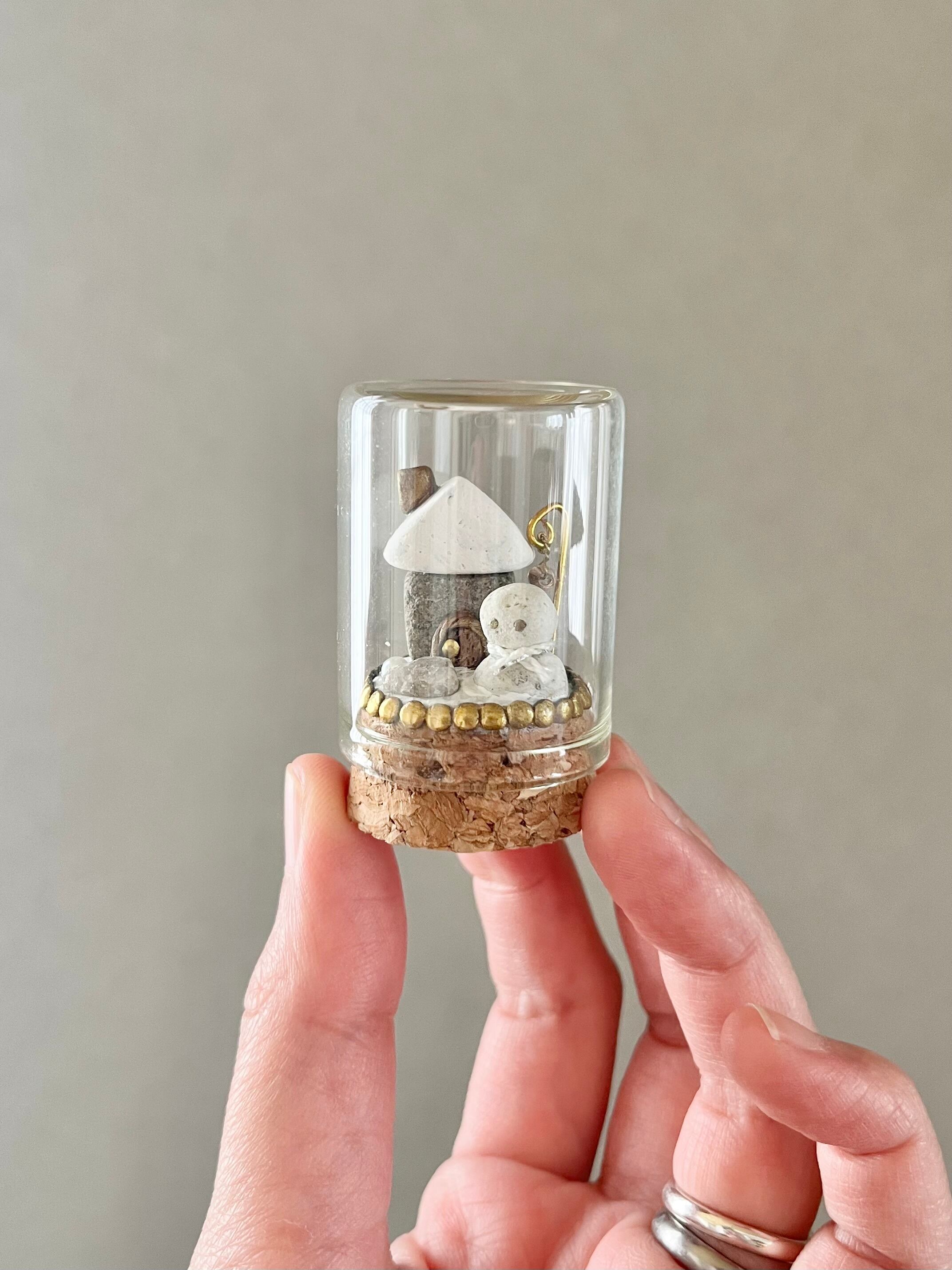 天然石、樹脂粘土、樹脂、アクリル絵具、木、ニス、小瓶