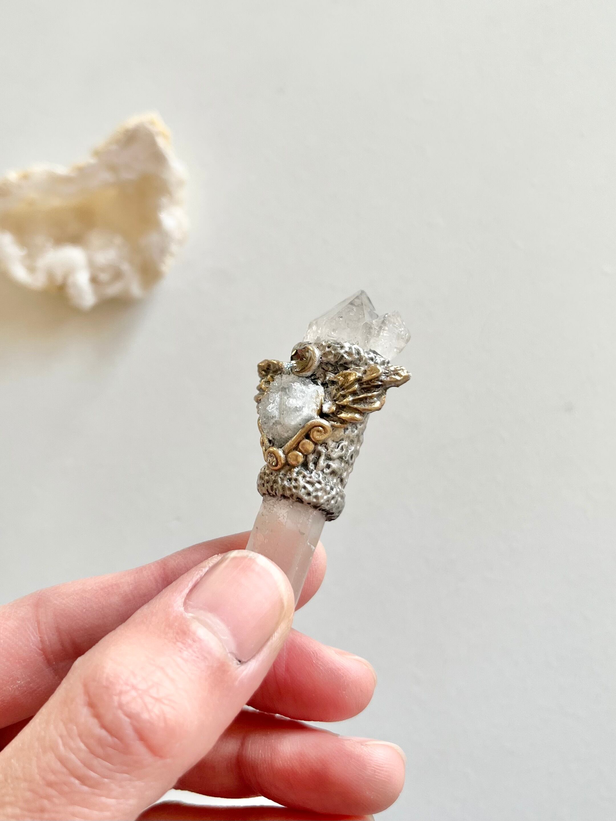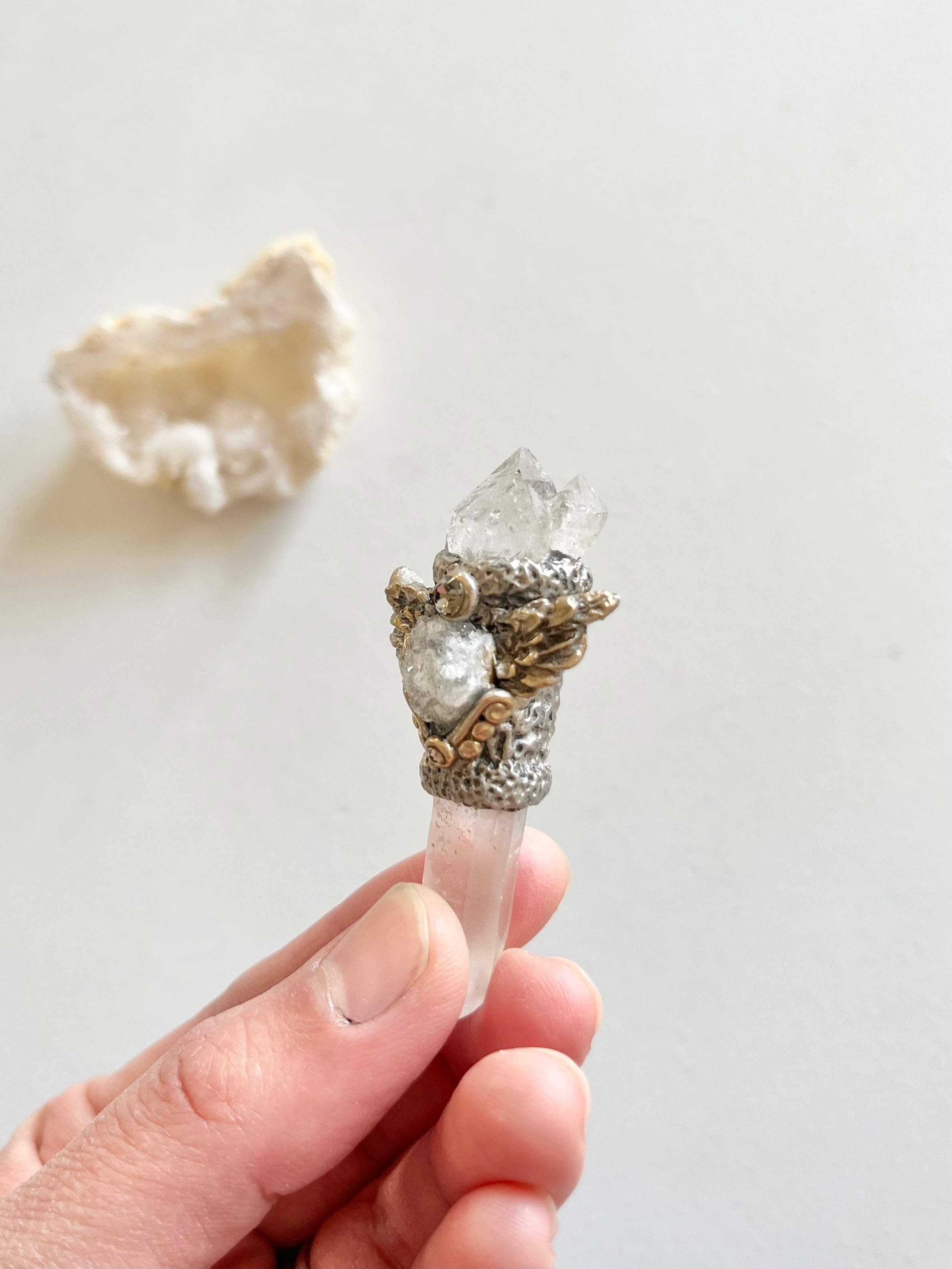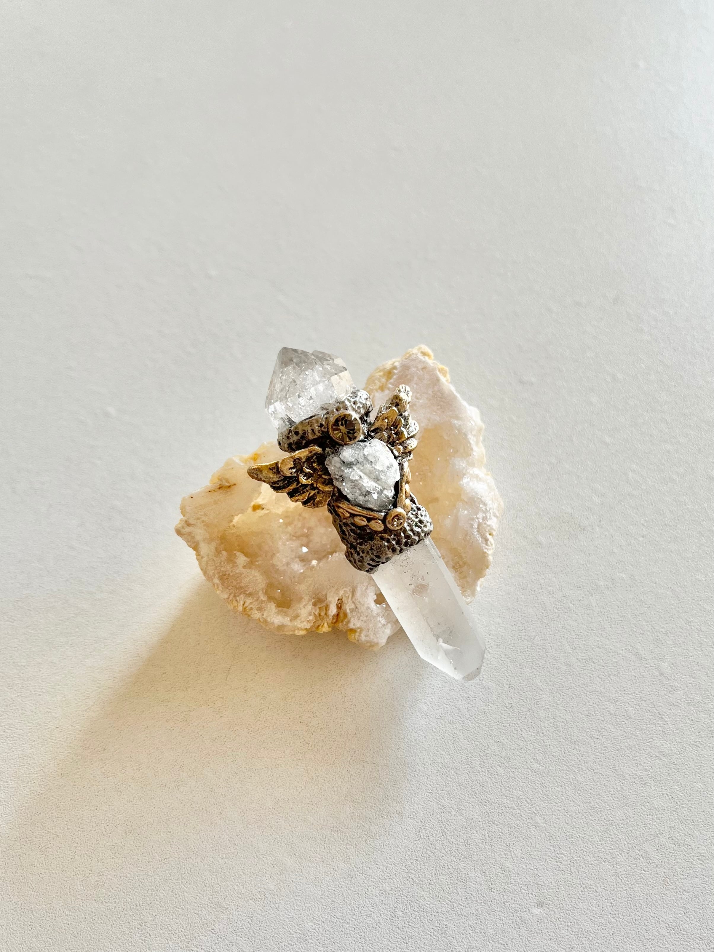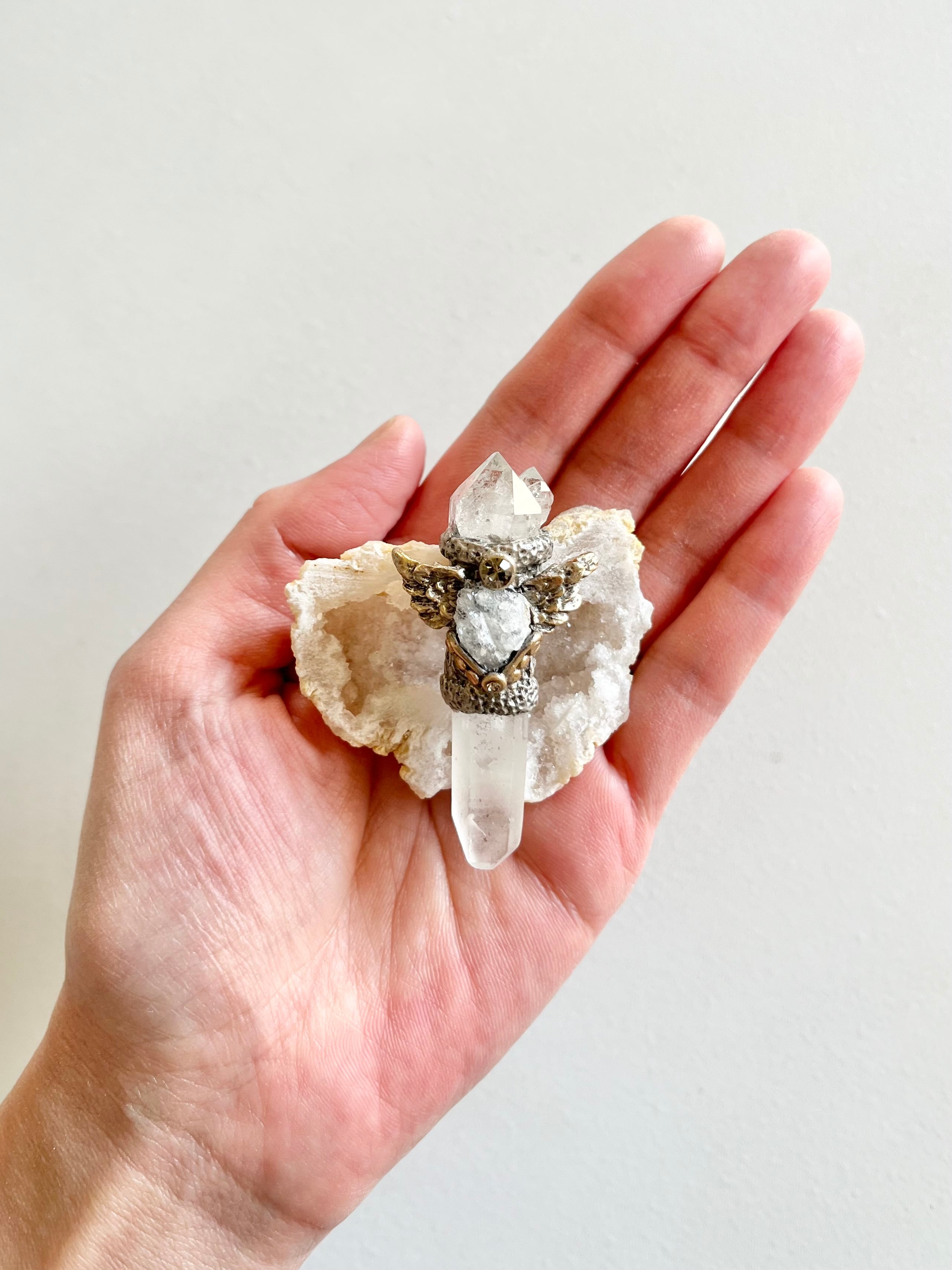 水晶ジオードは小さな結晶がきらきらと美しく、両翼を広げたようなカタチに見えたため、ミニワンドとセットにしました。