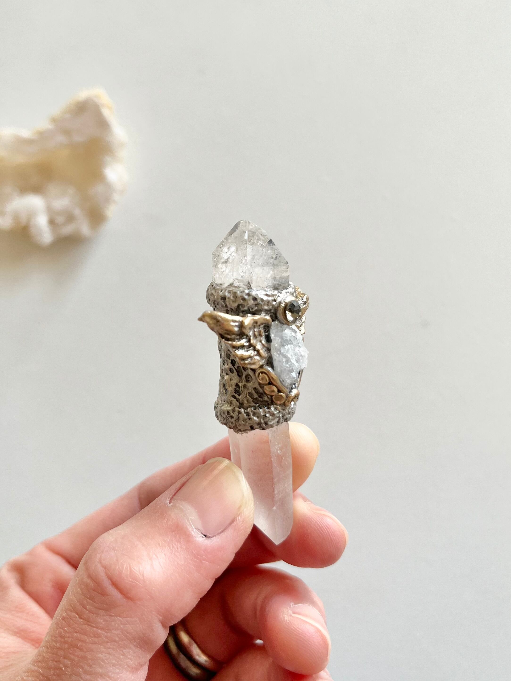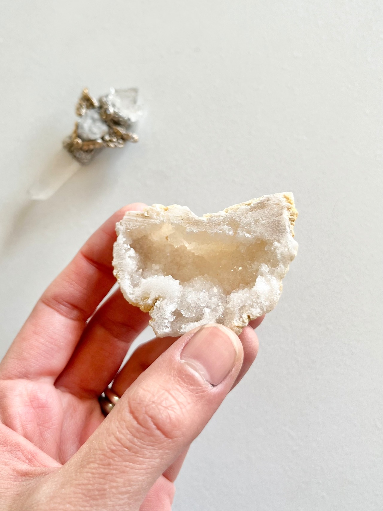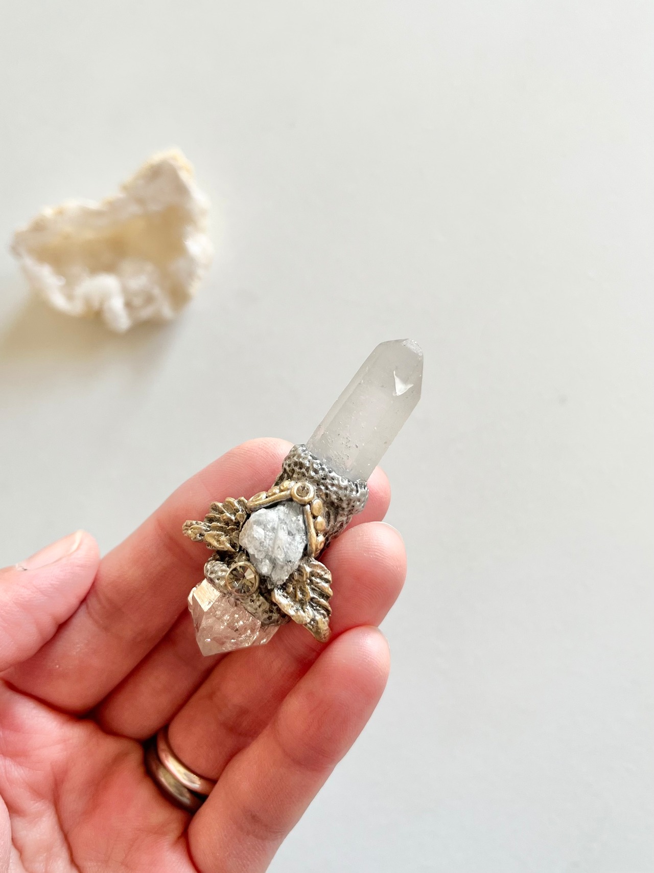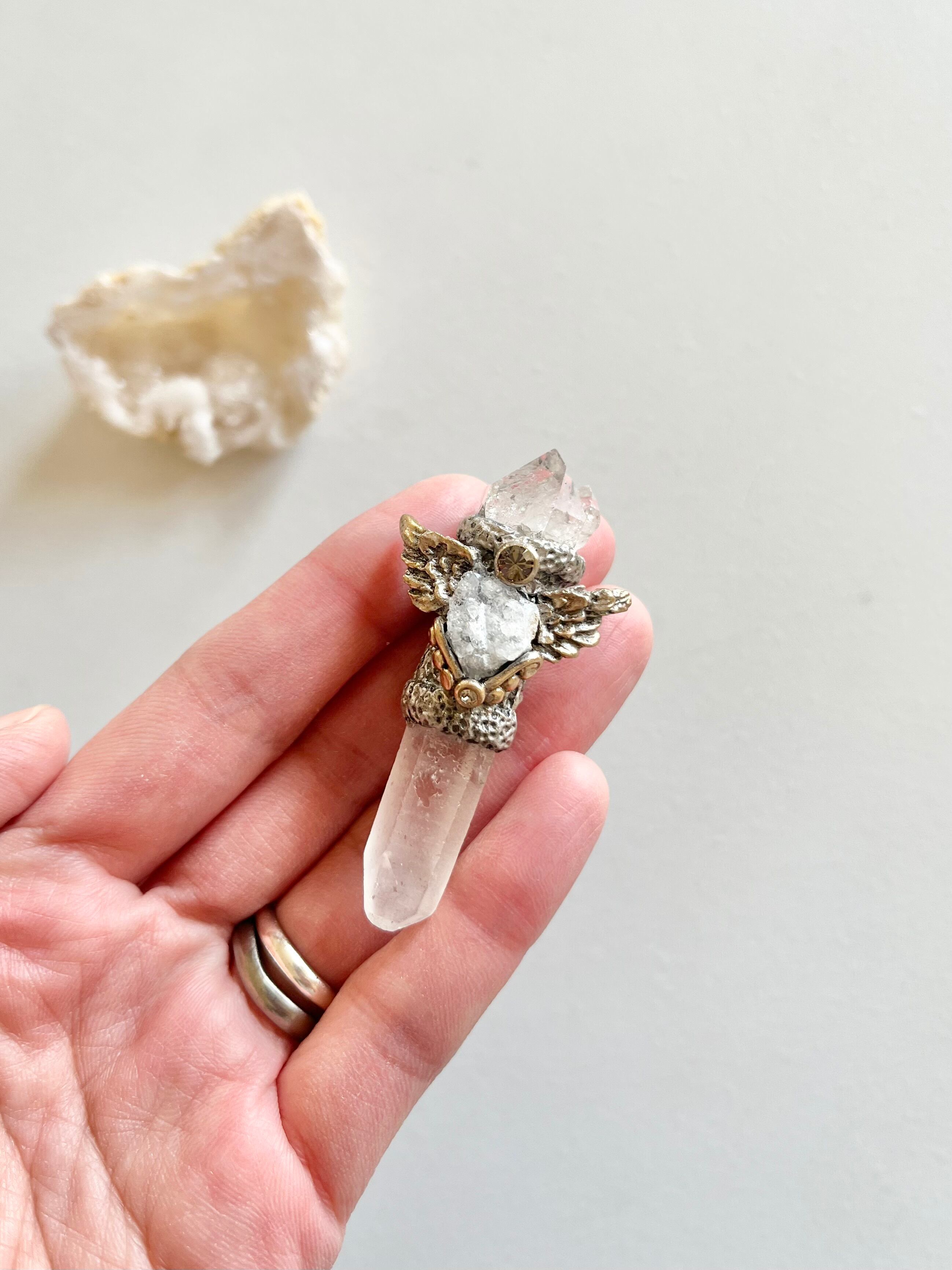 水晶ジオードは小さな結晶がきらきらと美しく、両翼を広げたようなカタチに見えたため、ミニワンドとセットにしました。