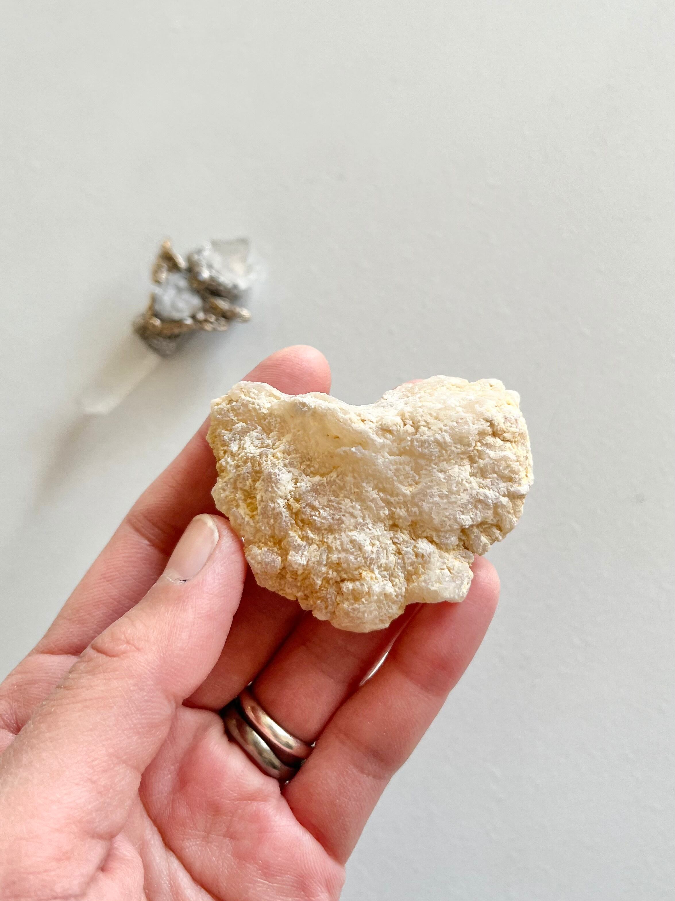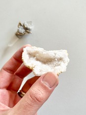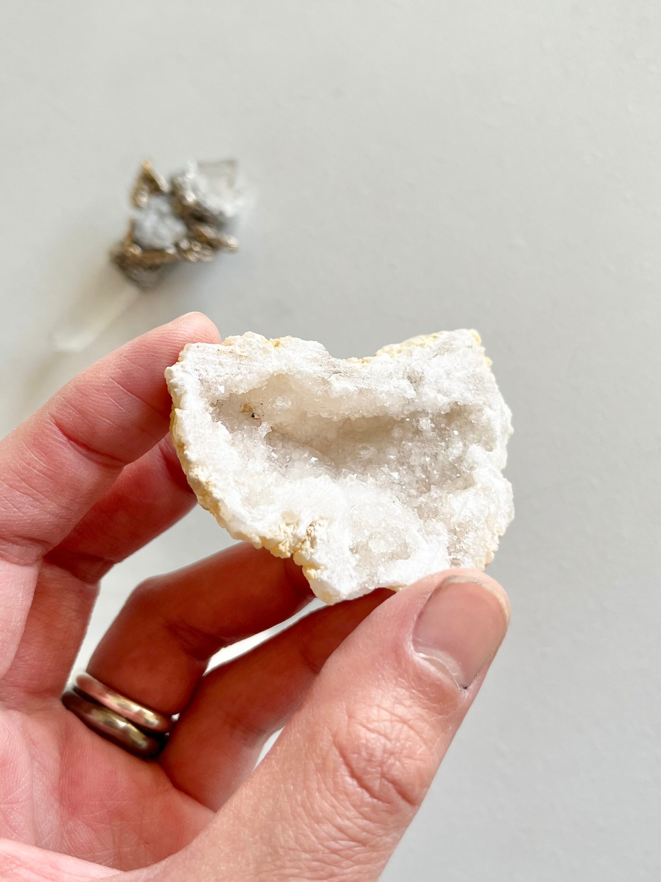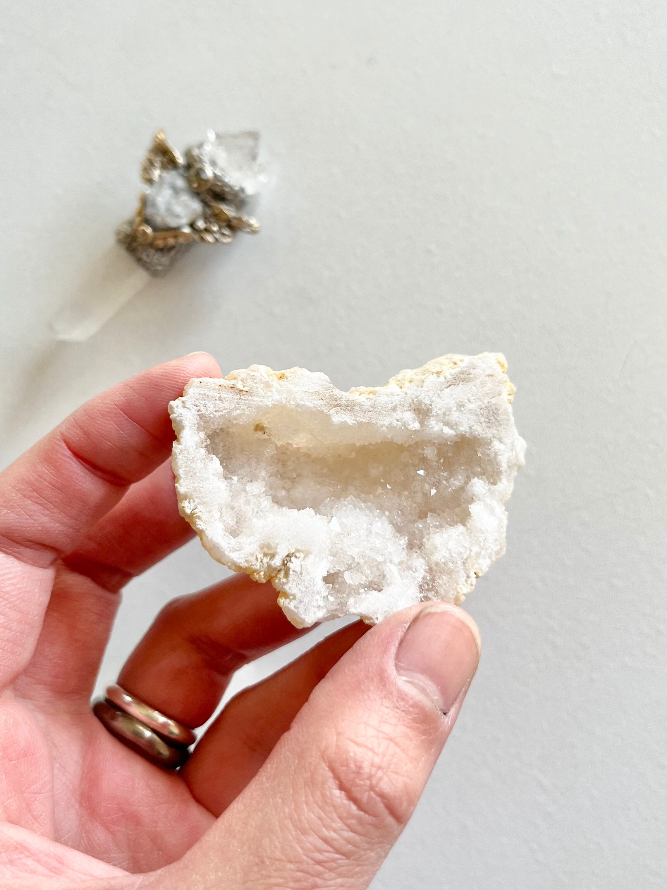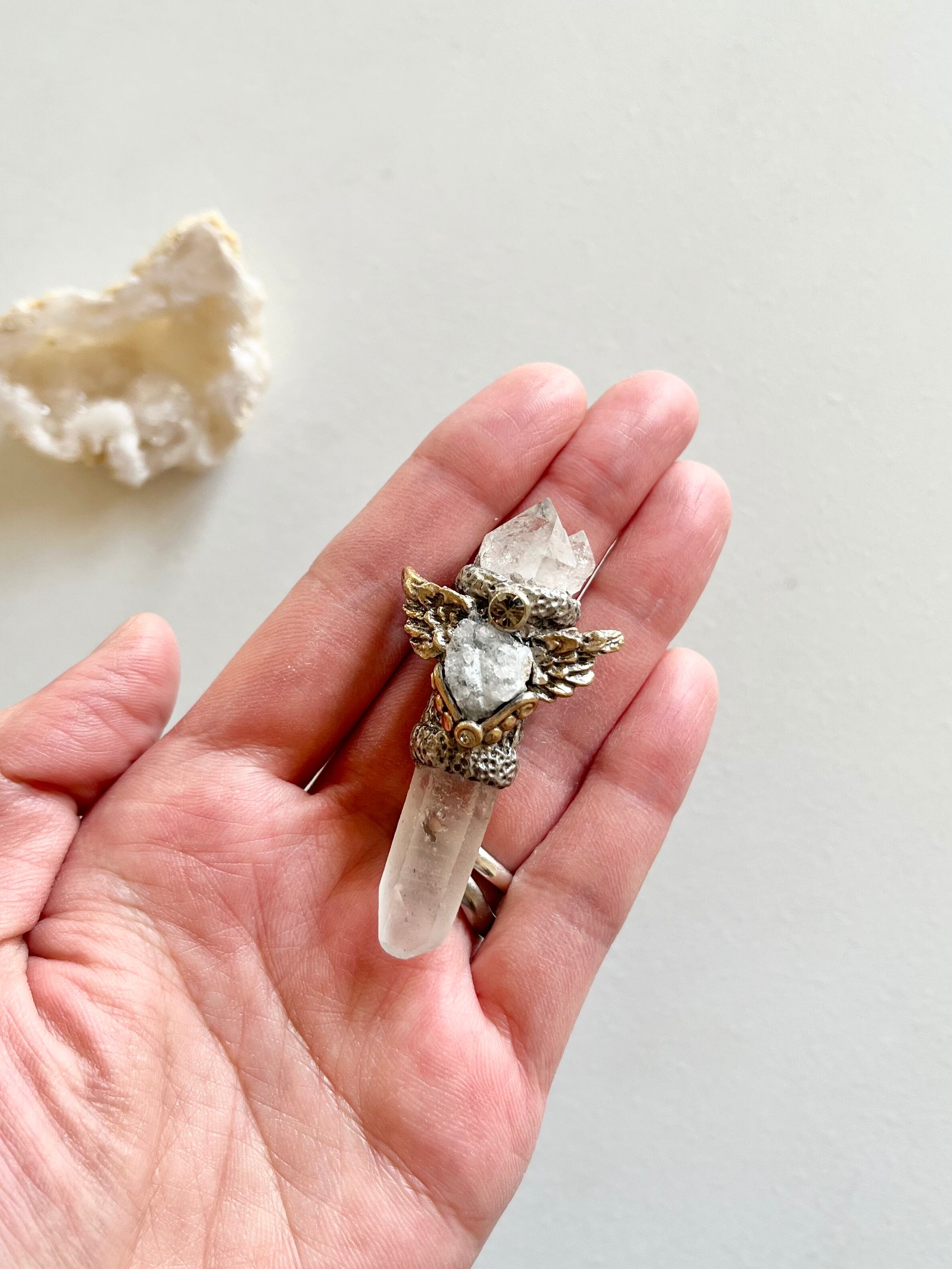 水晶ジオードは小さな結晶がきらきらと美しく、両翼を広げたようなカタチに見えたため、ミニワンドとセットにしました。