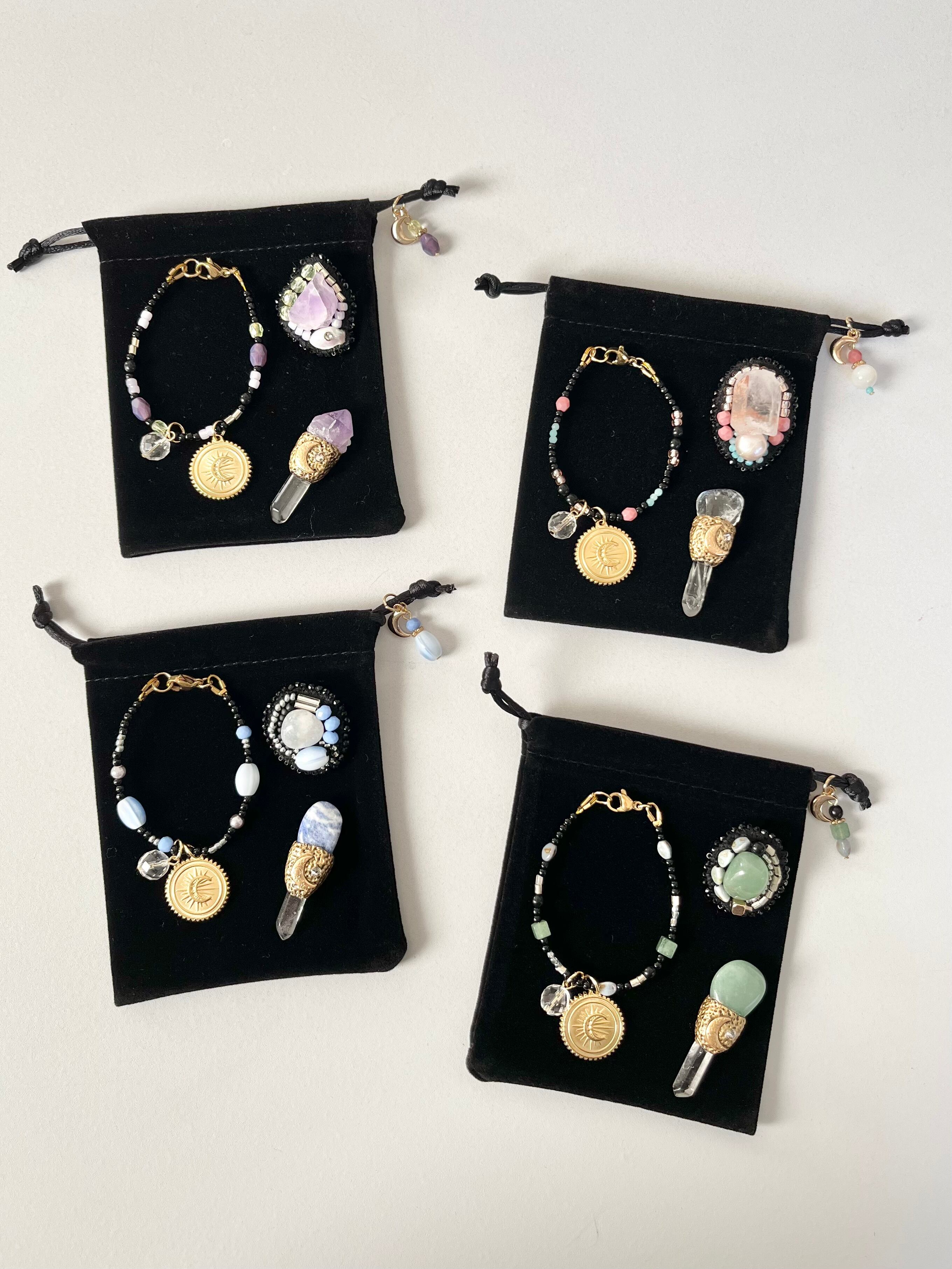 happyなセットにすべく、それぞれのブローチのテーマに合わせてバッグチャームとミニワンドを作りました。