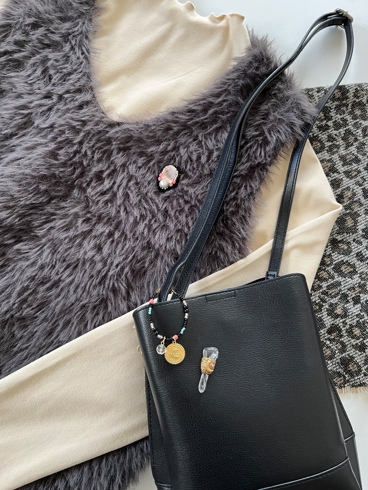 ブローチとバッグチャームはリンクデザインとなるようビーズを合わせました。